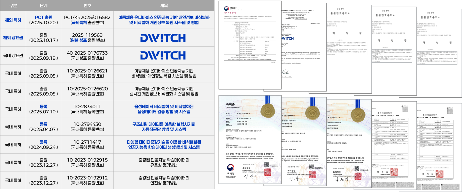특히 비정형 데이터 개인정보처리 분야에서 우리의 성과를 자랑스럽게 생각합니다. 우리는 지속적인 연구개발과 전문가 협력을 통해 최신 규제에 대응하고 있습니다. ㈜드위치의 목표는 고객이 안심하고 데이터를 활용할 수 있는 환경을 만드는 것입니다.